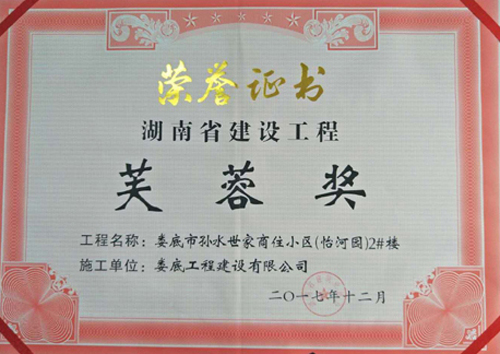 2018年1月19日,由湖南省建筑業協會舉辦的湖南省建設工程芙蓉獎頒獎會暨精品工程經驗交流會在長沙舉行。我司承建的婁底市孫水世家商住小區(怡河園)2#樓獲得湖南省建設工程質量最高獎—“芙蓉獎”殊榮。這是我司自市農業銀行綜合樓、市委市人民政府辦公樓1#、6#、7#、雙峰縣體育中心體育館喜獲“芙蓉獎”后,第四次獲得“芙蓉獎”殊榮。